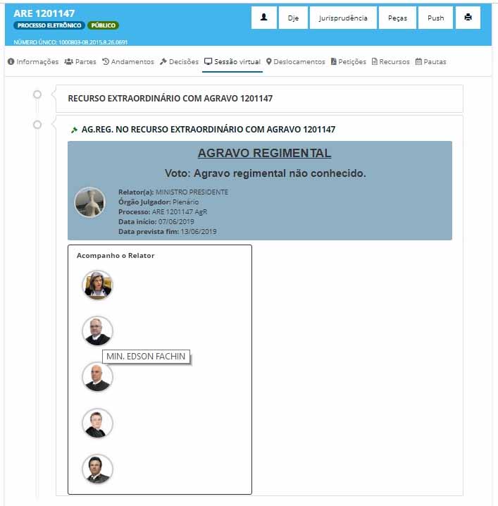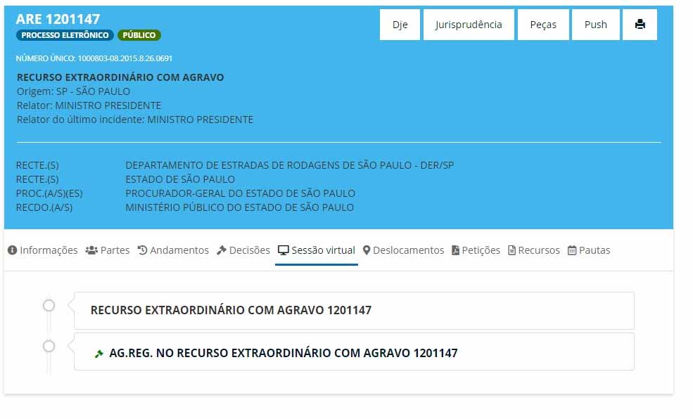 Exemplo: ARE 1201147-AgR (gráfico abaixo). Após clicar na aba “Sessão Virtual” serão exibidos os recursos do processo.