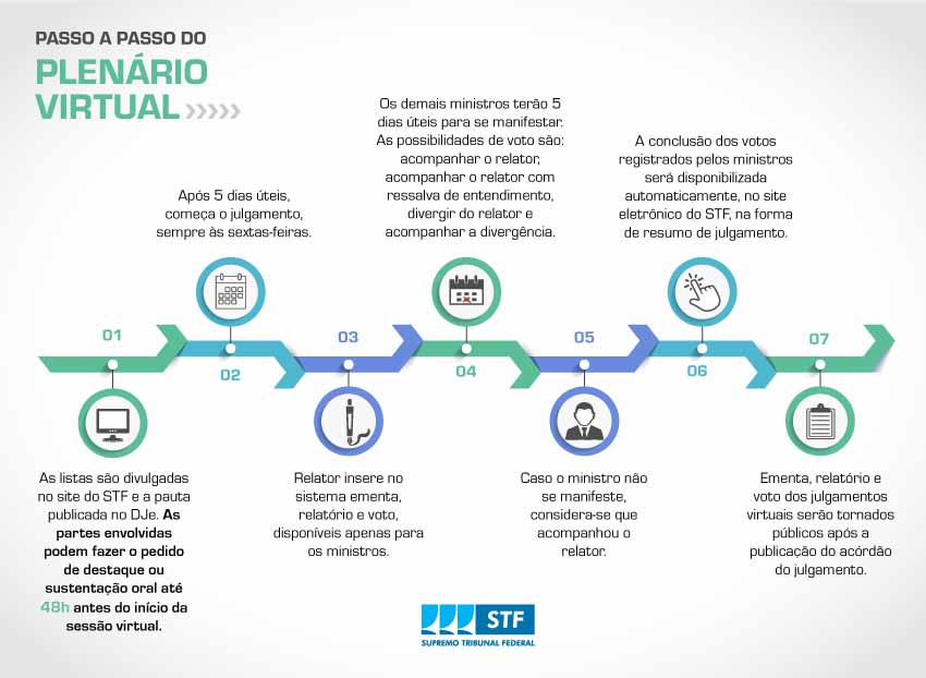 As sessões virtuais são realizadas semanalmente, com início às sextas-feiras. O relator lança no sistema ementa, relatório e voto e, iniciado o julgamento, os demais ministros têm até cinco dias úteis para se manifestar. Os demais ministros terão quatro opções de voto, possibilitando que acompanhem o relator, acompanhem com ressalva de entendimento, divirjam do relator ou acompanhem a divergência. Caso o ministro não se manifeste, considera-se que acompanhou o relator.