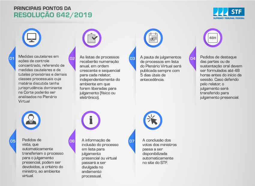 As mudanças decorrem de emenda ao Regimento Interno do STF, regulamentada pela Resolução 642/2019. A ampliação dos julgamentos em ambiente eletrônico permite que a prestação jurisdicional pela Corte seja acelerada.