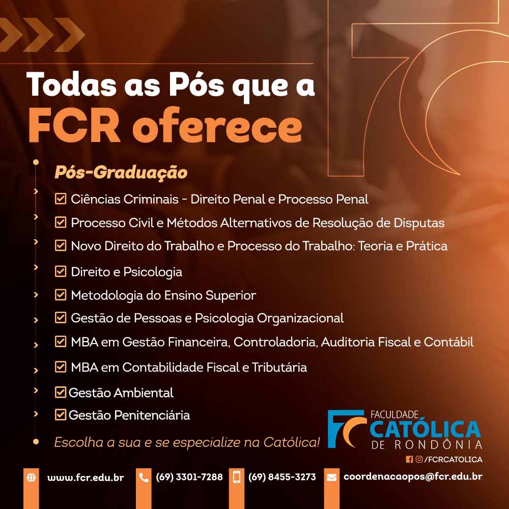 A Escola Superior de Advocacia de Rondônia (ESA/RO) e Faculdade Católica de Rondônia (FCR) firmaram uma parceria para oferecimento de descontos em cursos de pós-graduação para advogados rondonienses. Interessados em se especializar podem fazer a matrícula até dia 31 de julho pelo site da Faculdade ou na secretaria da instituição.