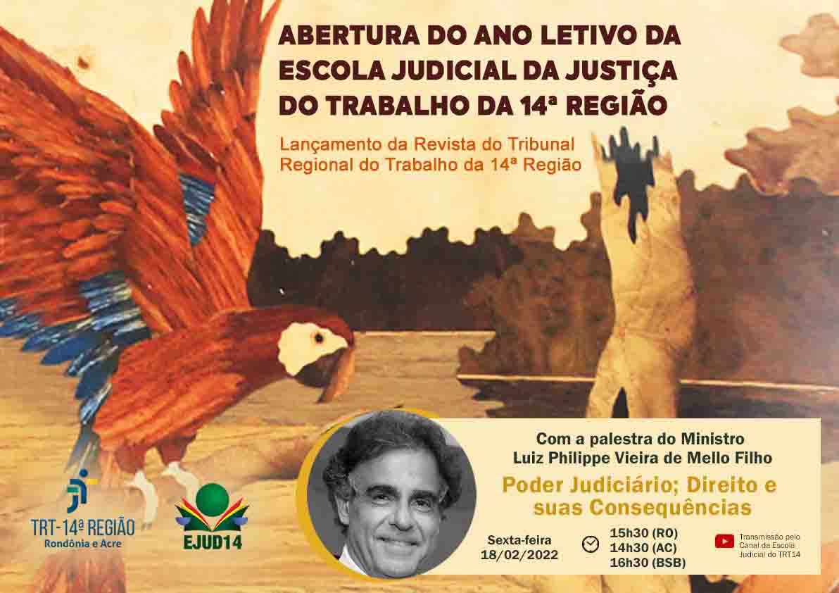 A Escola Judicial do Tribunal Regional do Trabalho da 14ª Região (Ejud14) realizará na próxima sexta-feira (18), às 15h30 (horário de Rondônia), a abertura do Ano Letivo 2022. O evento contará com a participação do atual vice-presidente do Tribunal Superior do Trabalho (TST), ministro Luiz Philippe Vieira de Mello Filho, que ministrará a palestra com o tema: "Poder Judiciário; Direito e suas consequências".