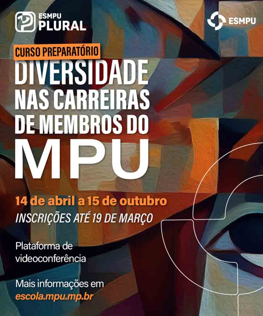 Com o compromisso de promover maior diversidade e representatividade nos quadros do Ministério Público da União (MPU), a Escola Superior do Ministério Público da União (ESMPU) lançou a primeira edição do Curso Preparatório Social "ESMPU Plural: Diversidade nas Carreiras do MPU". A iniciativa é voltada para pessoas negras, quilombolas, indígenas, com deficiência e transexuais, bacharéis em Direito, que desejam se preparar para os concursos de ingresso nas carreiras dos ramos do MPU. Inscreva-se.