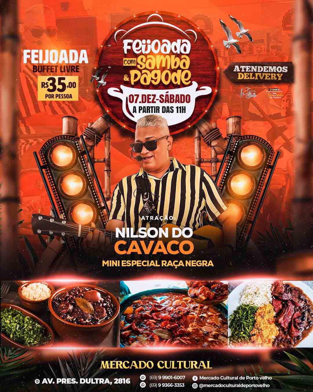 Hoje, dia 07, na tradicional 'Feijoada Com Samba e Pagode', vai ter show do músico Nilson do Cavaco, onde vai rolar um mini especial Raça Negra, na sequência, show do grupo Pagode Na Veia.