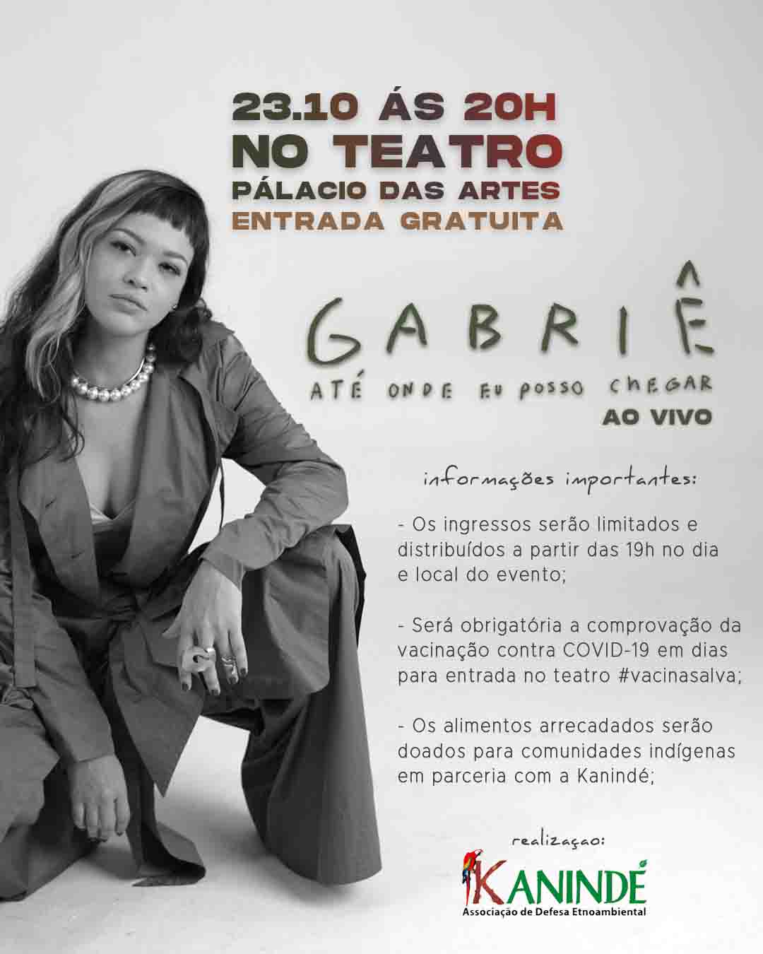 Fazendo jus aos posicionamentos artísticos e sociais, Gabriê explica que o show será aberto ao público, mediante a doação de alimentos não perecíveis, respeitando a capacidade máxima do teatro, levando em consideração a realidade atual da pandemia. “Acredito que o acesso à arte deve ser democrático e eu quero ter a possibilidade de chegar em todas as pessoas, em todos os locais, e tocá-las de alguma forma com algo que foi criado e inspirado aqui, fruto da nossa terra, da nossa cultura. O atual momento ainda pede restrições e cuidados, mas tornar esse espaço do teatro e meu show acessível de alguma forma para a nossa gente me enche de alegria”, finaliza.