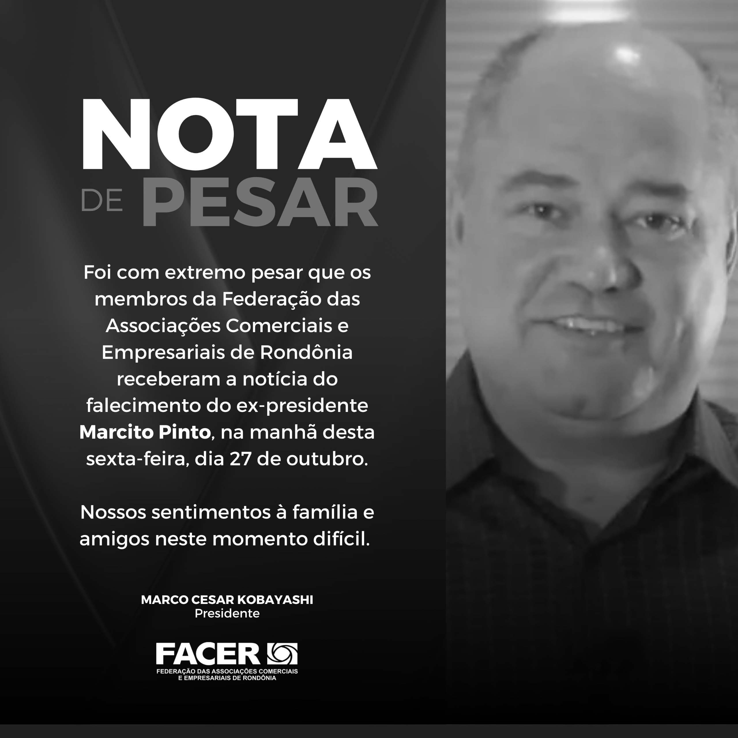 Foi com extremo pesar que os membros da Federação das Associações Comerciais e Empresariais de Rondônia (FACER) receberam a notícia do falecimento do ex-presidente Marcito Pinto, na manhã desta sexta-feira, dia 27 de outubro.