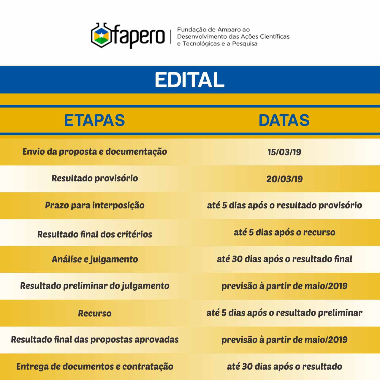 Destinada às instituições de ciência e tecnologia de iniciativa pública sediadas em Rondônia, a chamada selecionará projetos de pesquisa científica, tecnológica e de inovação, para receberem apoio financeiro com recursos de custeio e capital para pesquisas que visem o desenvolvimento de novos produtos, processos e serviços inovadores, promoção da interação entre institutos de ciência e tecnologia com o setor privado e sociedade.