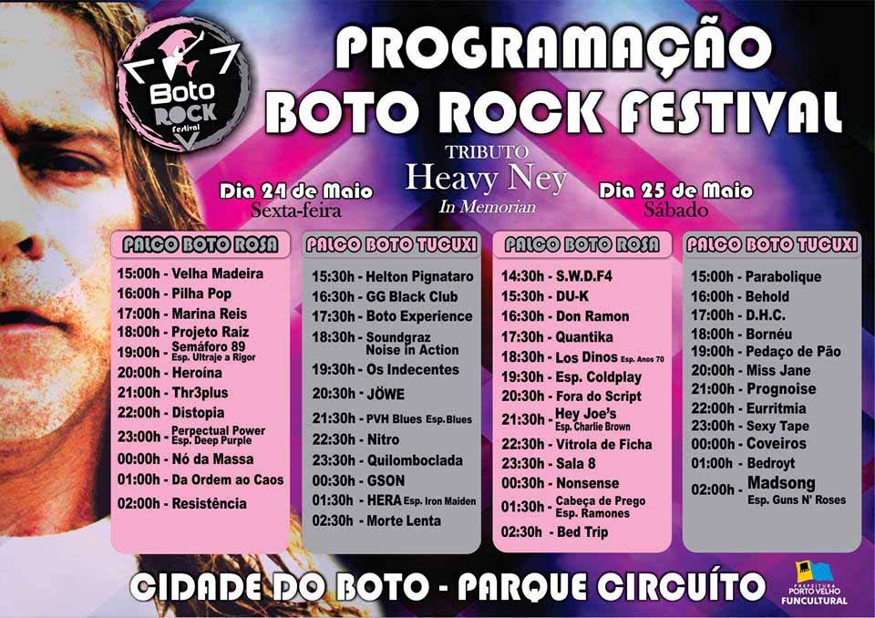 Realizada pela Prefeitura de Porto Velho, o "Festival Boto Rock 2019" está confirmado para os dias 24 e 25 de maio, onde pretende envolver 50 bandas da Capital, somando 230 artistas, no Parque Circuito. O evento é coordenado pela Fundação Cultural do Município (Funcultural) que, nesta semana, divulgou a programação oficial.