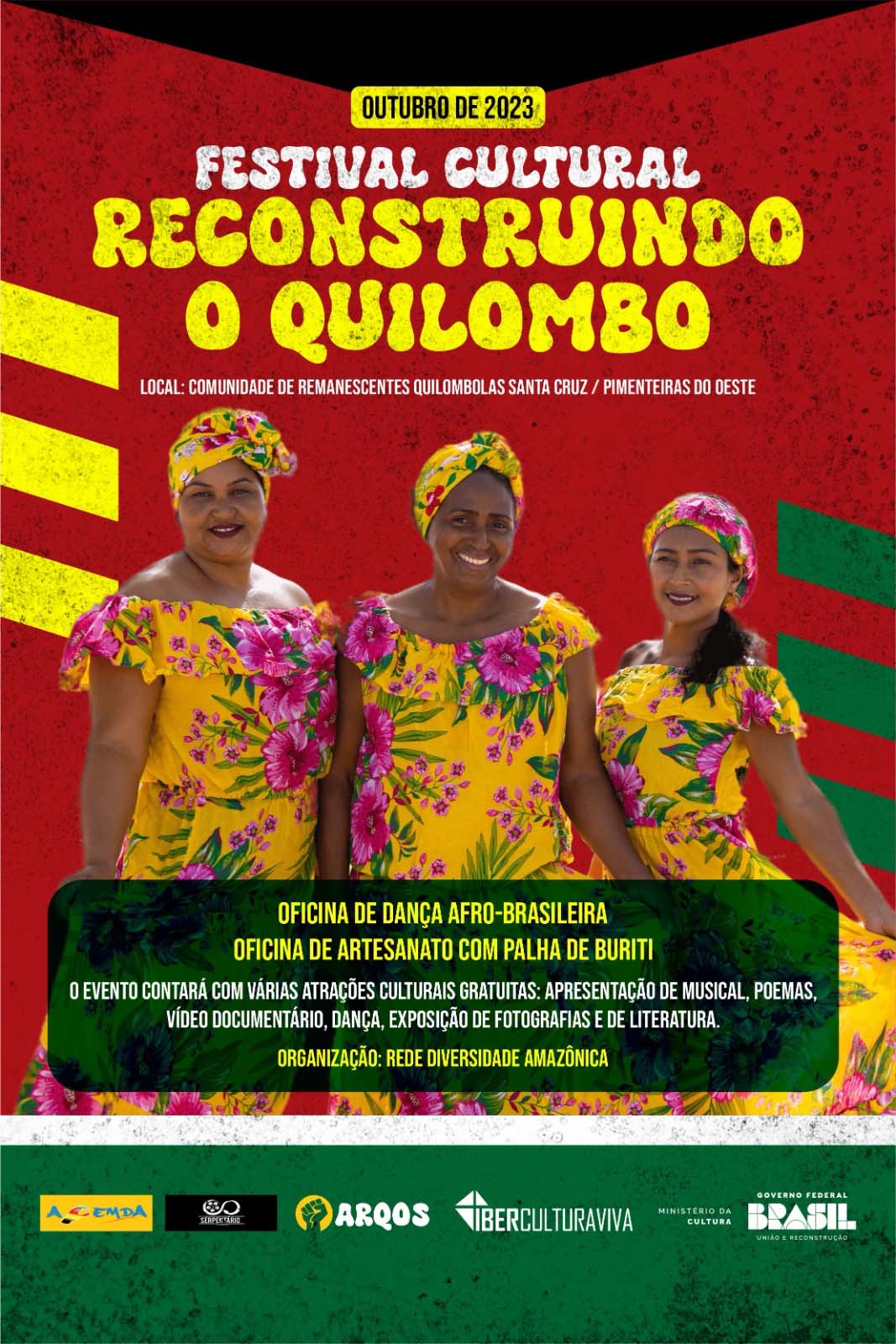 O Festival Cultural Reconstruindo o Quilombo é uma ocasião especial para celebrar e aprender sobre a história e a cultura quilombola em Pimenteiras do Oeste, Rondônia, valorizando a rica herança quilombola da região amazônica. Este evento promete ser uma demonstração vibrante e inspiradora da diversidade e riqueza cultural que fazem do Brasil uma nação tão extraordinária.