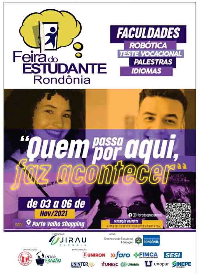 A edição 2021 da Feira do Estudante Rondônia Internacional acontece de 3 a 6 de novembro, no Porto Velho Shopping, e vai contar com a participação da Federação das Indústrias de Rondônia (FIERO) e seus braços operacionais SESI-SENAI-IEL. A programação diversificada inclui palestras, teatro, atividades de aventura, simulados e testes profissionais para aqueles jovens que buscam enriquecer a sua formação.