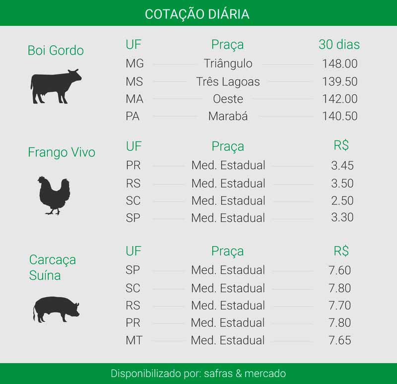 Já a cotação da arroba do boi gordo começou o dia com alta de 0,56% no preço e o produto é negociado a R$ 153,90 no estado de São Paulo. O valor da arroba da vaca gorda chega a R$ 129 na região Sul de Goiás. Nas cidades paulistas de Barretos e Araçatuba, o preço do produto é R$ 138,50. Os valores são do Canal Rural e Cepea.