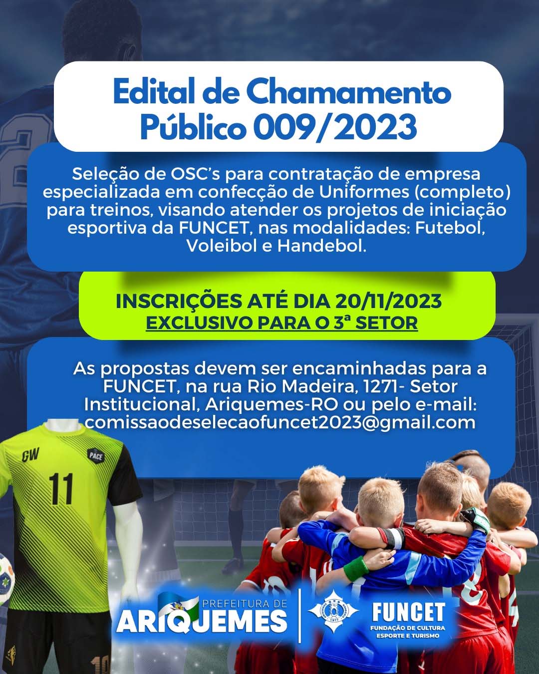 Na manhã desta sexta-feira (10), a Fundação de cultura, Esporte e Turismo - FUNCET, publicou o Edital nº 009/2023 para a seleção de OSC’s para contratação de empresa especializada na confecção de Uniformes esportivos para atender os projetos de iniciação esportiva nas modalidades: Futebol, Voleibol e Handebol.