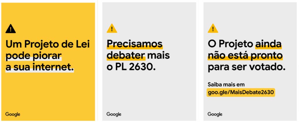 O posicionamento do Google está acessível no blog do Google Brasil e alerta para possíveis efeitos indesejados do projeto para a internet aberta e para as milhões de pessoas que utilizam seus produtos e serviços, como a ferramenta de Busca, o YouTube e as plataformas de anúncios. A empresa também levará ao ar uma campanha publicitária para chamar a atenção dos brasileiros para o assunto.