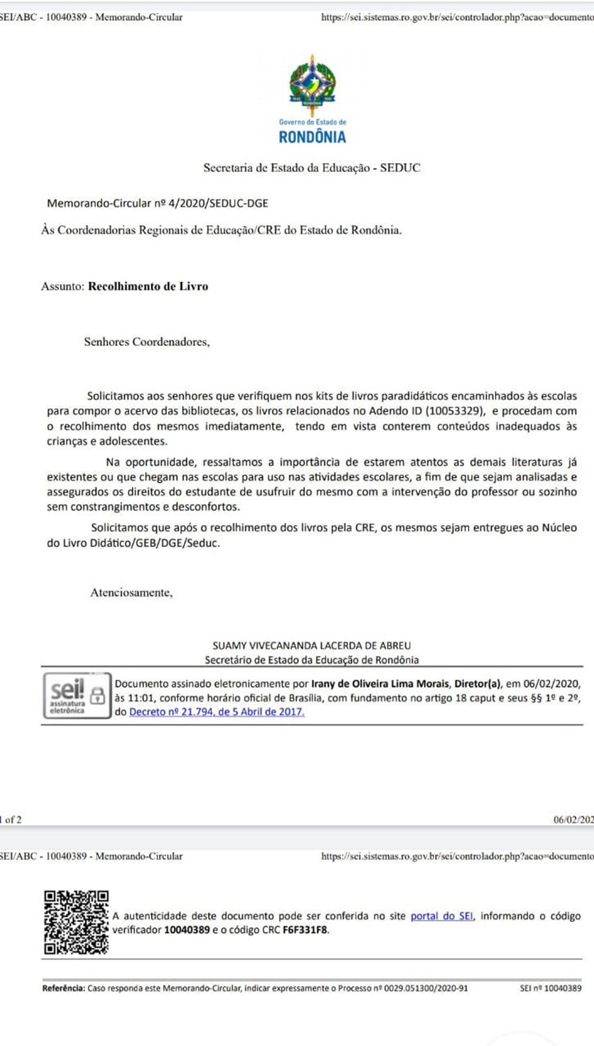 A reportagem da Folha confirmou que o memorando e a relação de livros de Rondônia são oficiais. Os documentos foram encaminhados a coordenadores regionais de Educação do estado, e o processo ainda consta no sistema de processos da secretaria.