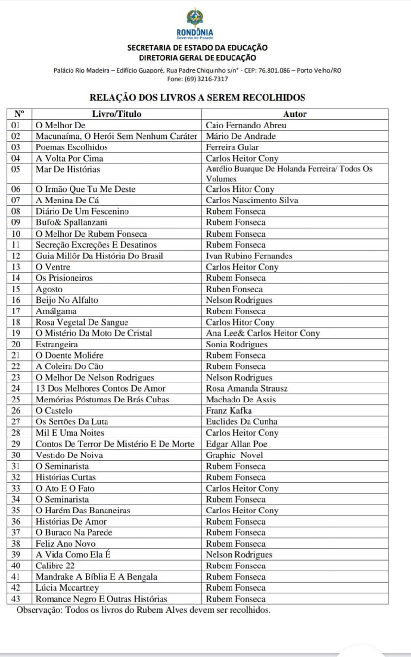 A relação traz ainda uma observação: "Todos os livros do Rubem Alves devem ser recolhidos". Morto em 2014, Alves escrevia sobre educação e questionava o formato tradicional da escola.