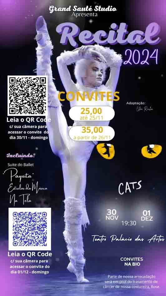 O Recital 2024 do Grand Sauté Studio promete encantar ainda mais o público, que será presenteado com duas apresentações, ambas no palco do Teatro Palácio das Artes. A primeira dia 30 de novembro (sábado) e a segunda, em 1o de dezembro (domingo), a partir das 19h30.