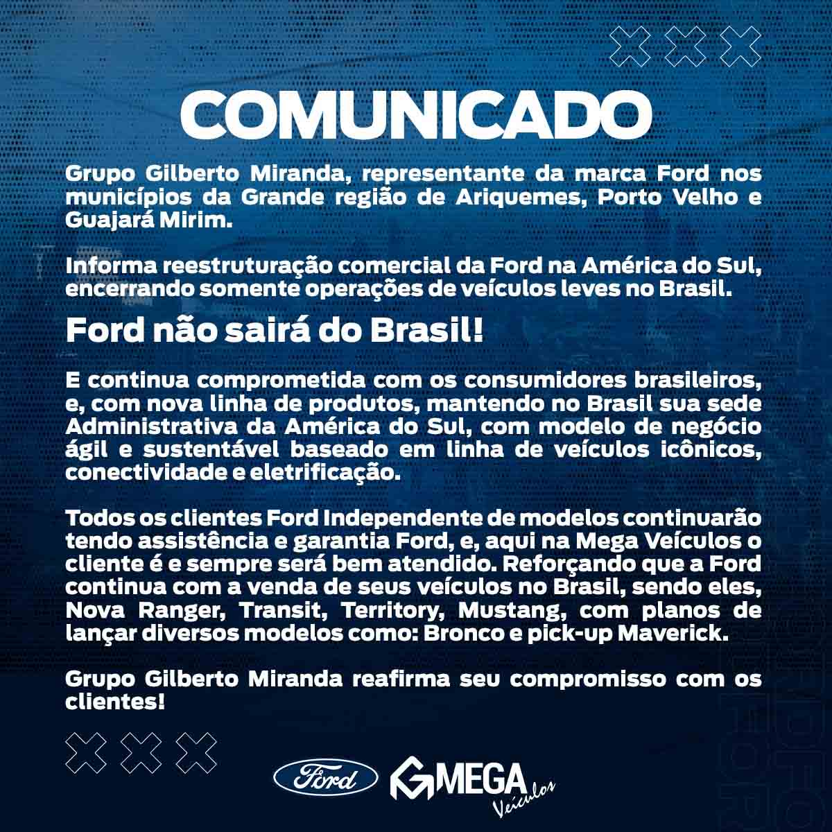 O Grupo Gilberto Miranda, representante da marca Ford nos municípios da Grande região de Ariquemes, Porto Velho e Guajará Mirim, informa que a reestruturação comercial da Ford na América do Sul, encerra somente operações de veículos leves no Brasil.