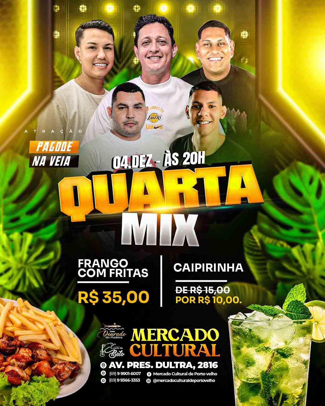 "Já é tradição as nossas 'Quarta Das Comidas Nordestinas', que começa às 10h40 e prossegue até 14h40, no Mercado Cultural de Pvh", disse o empresário Sinésio Tapajós, permissionário do box Dourado do Madeira acrescentando que ainda hoje, no início da noite, vai ter transmissão em telão de Led dos jogos Flamengo X Criciúma, e Internacional X Botafogo, e show do grupo Pagode Na Veia.