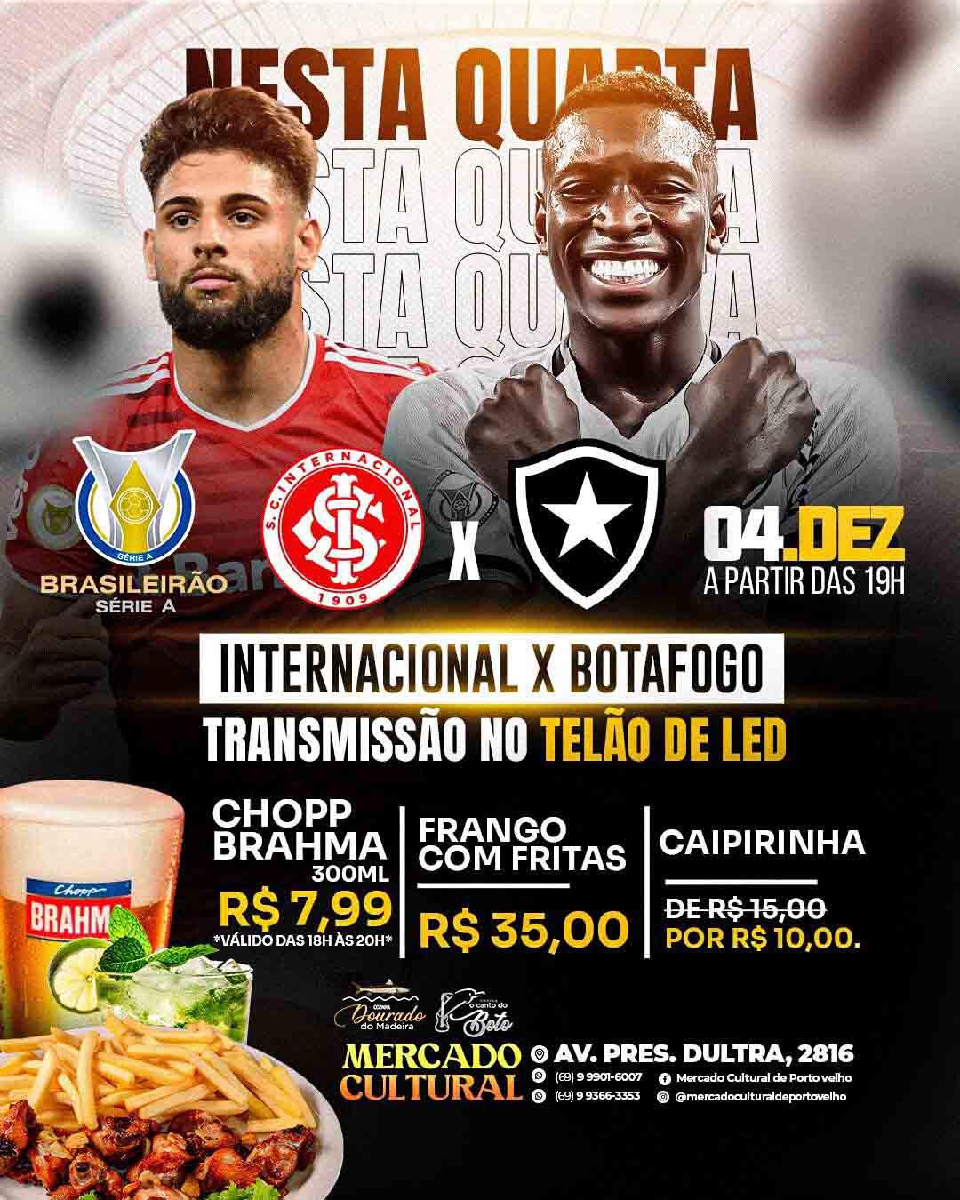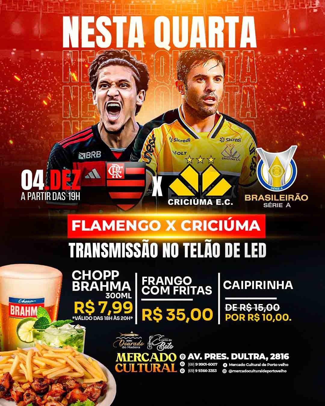 Ainda na quarta-feira, na parte interna do Mercado Cultural, terá telão de Led para transmissão dos jogos do Flamengo X Criciúma, e do Internacional X Botafogo.