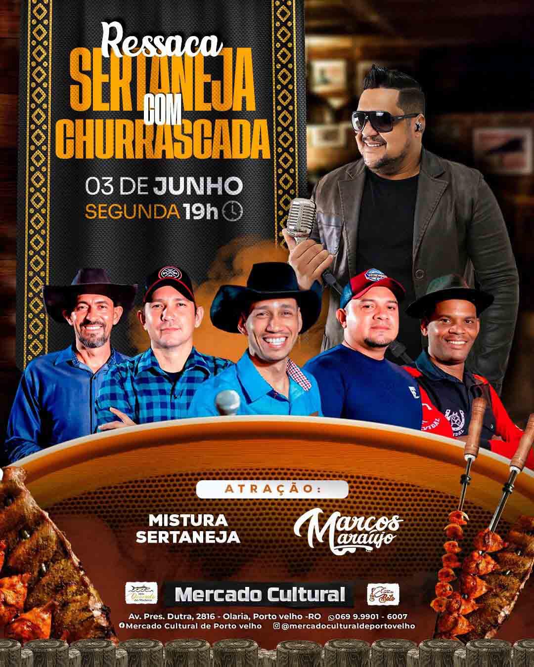 Tem novidade na edição do dia 03, da tradicional e melhor noite de segunda-feira da capital rondoniense, a 'Ressaca Sertaneja Com Churrascada'', realizado no Mercado Cultural de Pvh, com show duplo e gratuito, com início da primeira atração, a partir das 19h.