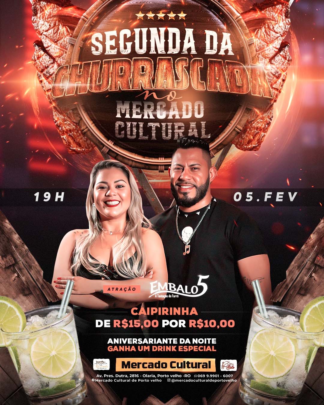 "A melhor noite de segunda-feira da capital rondoniense está com o tema novo", enfatizou o empresário Sinezio Tapajós, permissionário do box Dourado do Madeira, localizado no Mercado Cultural de Pvh, se ferindo a 'Segunda da Churrascada', que começa às 19h, e show às 20h, com a banda Embalo 5.