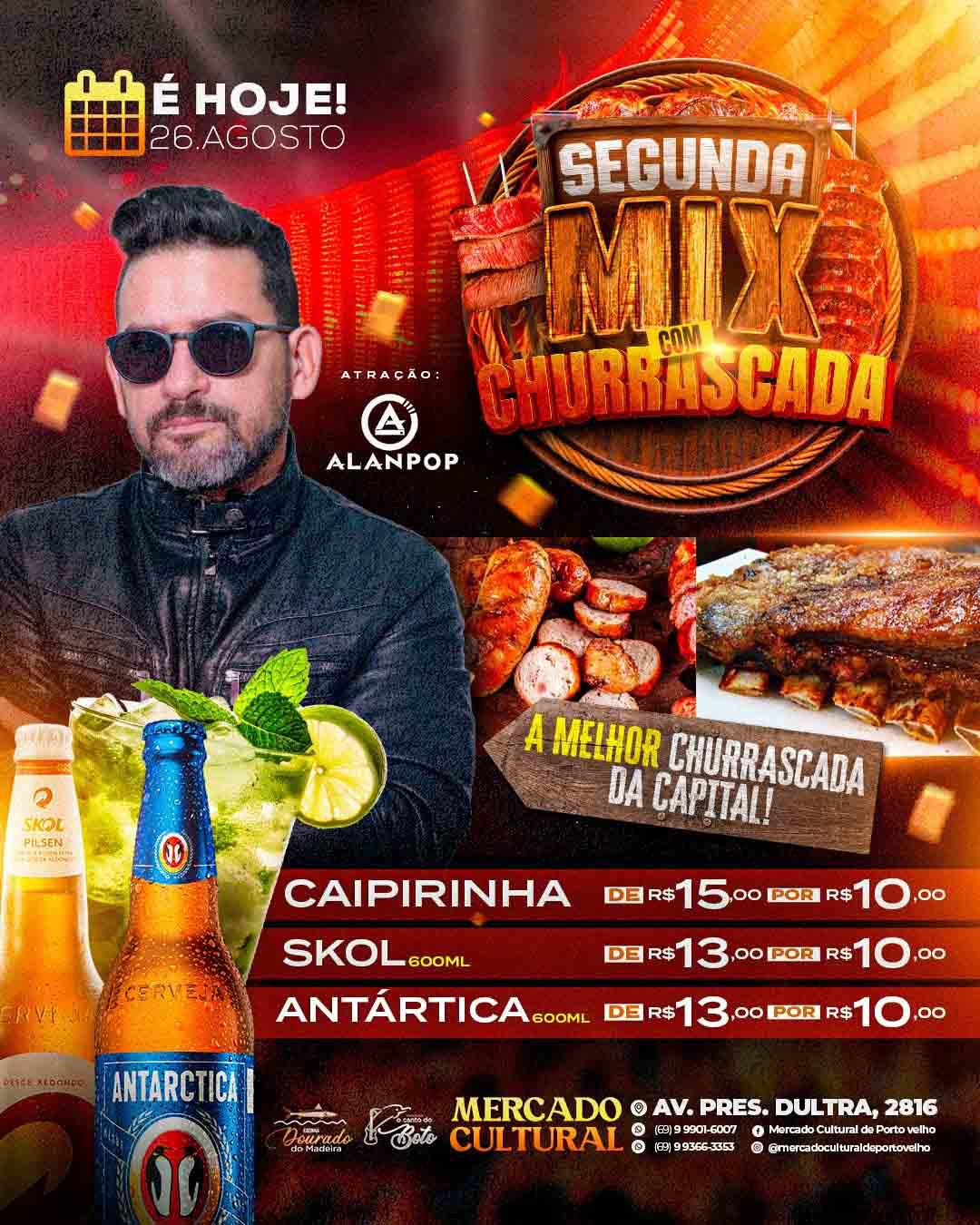 "Agora, a nossa melhor noite de segunda-feira da capital rondoniense, passará a se chamar de 'Segunda Mix', acompanhada daquela churrascada e os drinks especiais", disse o empresário Sinezio Tapajos, permissionário do box Dourado do Madeira, localizado no Mercado Cultural de Porto Velho. O evento começa às 19h, com show do Dj Alan Pop.