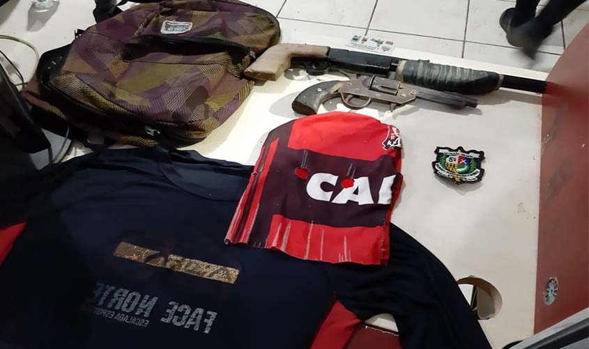 Os policiais do 5° Batalhão, após receber a denúncia, se deslocaram para as proximidades, onde fizeram o cerco com ajudar de outras guarnições e conseguiram localizar o suspeito em uma residência, sendo encontradas, também, duas armas de fogo: uma caseira e um revólver sem munições.