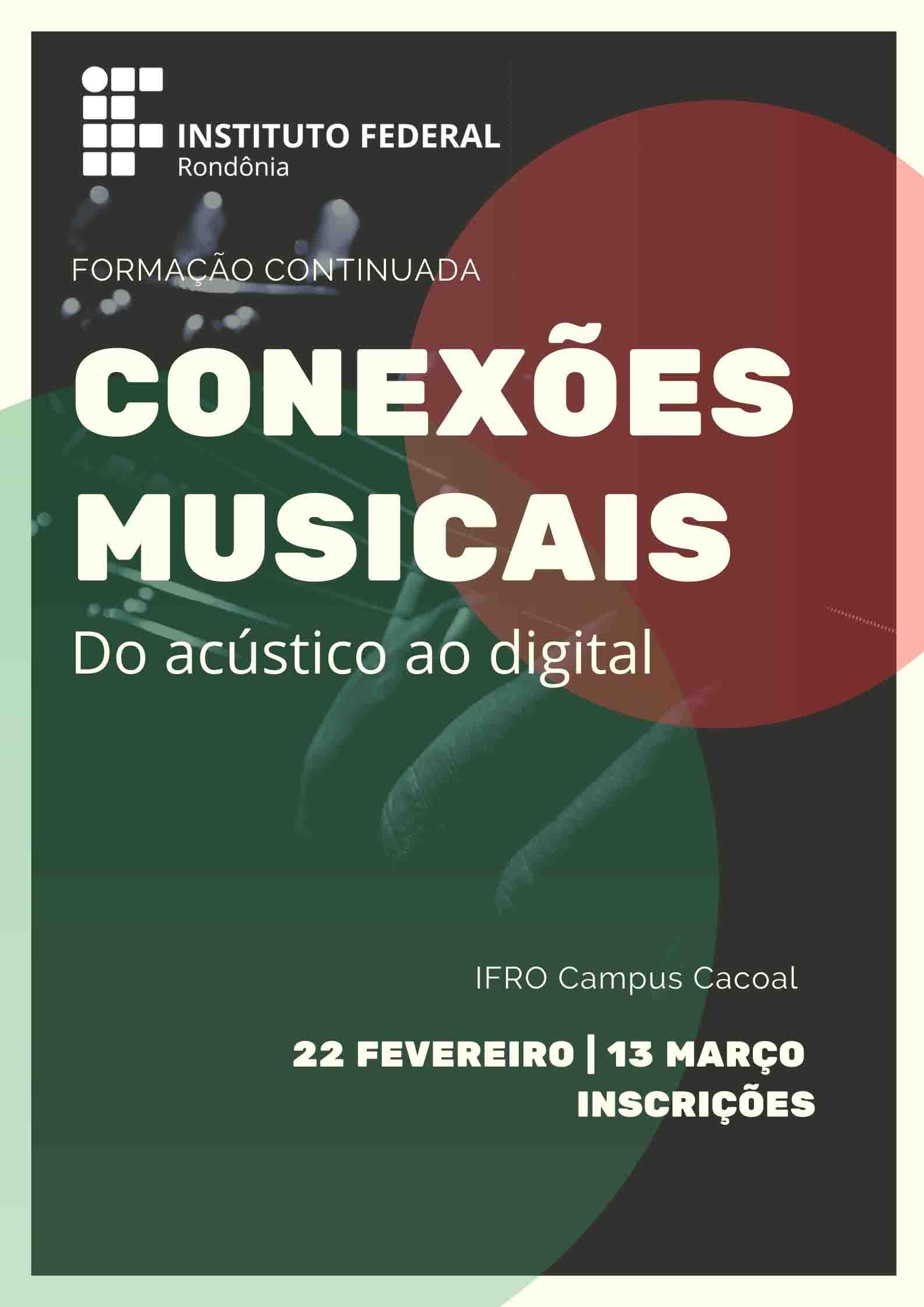 Entre os dias 22/02 e 13/03 o Instituto Federal de Educação, Ciência e Tecnologia de Rondônia (IFRO) Campus Cacoal estará selecionando interessados em participar do curso de formação continuada "Conexões Musicais: do acústico ao digital." O curso será realizado no formato semipresencial, ou seja, parte da carga horária será realizada a distância e outra parte de maneira presencial. Ao todo, são ofertadas 40 vagas.