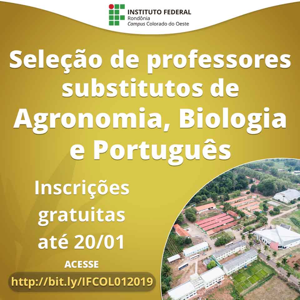 O Instituto Federal de Educação, Ciência e Tecnologia de Rondônia (IFRO), Campus Colorado do Oeste, está com inscrições abertas para o Processo Seletivo Simplificado para a contratação de professores substitutos nas áreas de Agronomia, Biologia e Língua Portuguesa, com uma vaga cada.