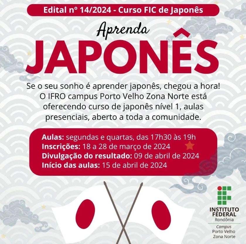 O Instituto Federal de Educação, Ciência e Tecnologia de Rondônia (IFRO), Campus Porto Velho Zona Norte, por meio do Centro de Idiomas, abre inscrições para o processo de seleção simplificado de alunos para o Curso de Formação Inicial (FIC) em Japonês. As inscrições para as 20 vagas ofertadas poderão ser feitas de forma remota, por este link aqui.