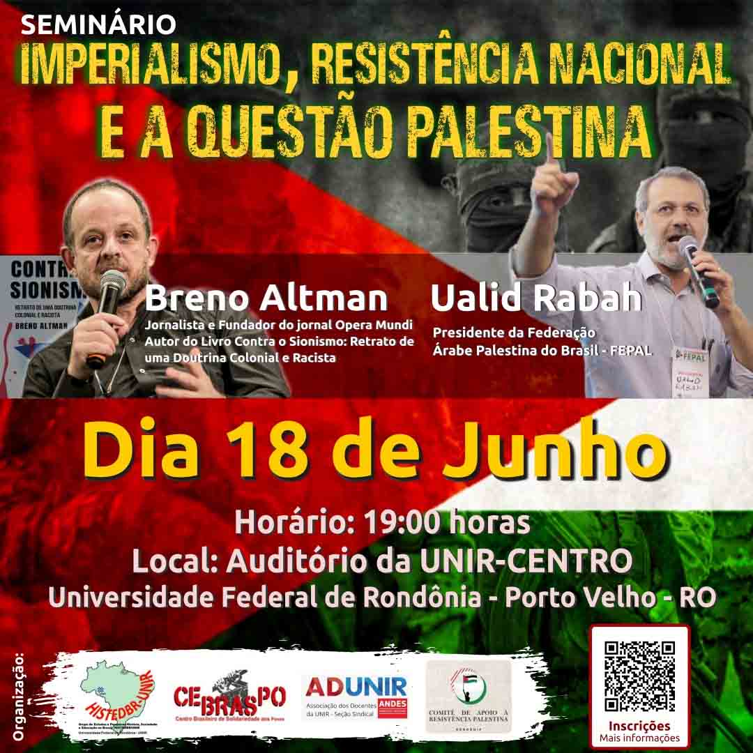 A Universidade Federal de Rondônia (UNIR), por meio do Grupo de Pesquisa "História, Sociedade e Educação no Brasil" (HISTEDBR/UNIR), em parceria com a Associação dos Docentes da Universidade Federal de Rondônia UNIR (ADUNIR-SSIND) Seção Sindical do ANDES-Sindicato Nacional, o Centro Brasileiro de Solidariedade aos Povos (CEBRASPO), e o Comitê de Solidariedade a Resistência Palestina – Rondônia realiza o Seminário “Imperialismo, libertação nacional e a questão palestina”, com a presença de Breno Altman (Jornalista e fundador do Ópera Mundi) e Ualid Rabah (Presidente da Federação Árabe Palestina – FEPAL).