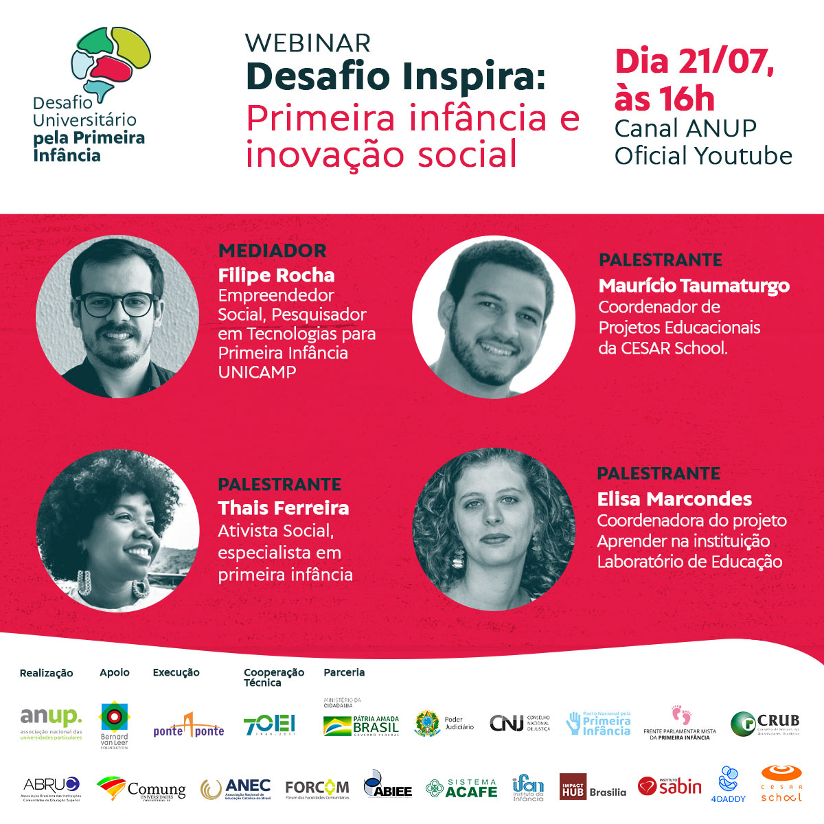 Para apoiar participantes e pessoas interessadas, a organização do Desafio realiza mais um webinar, agora com o tema “Primeira Infância e Inovação Social”. Com a participação de Maurício Taumaturgo, coordenador de Projetos Educacionais do CESAR, Thais Ferreira, especialista em primeira infância, e Elisa Marcondes, coordenadora do projeto Aprender na instituição Laboratório de Educação, o encontro virtual é nesta terça-feira (21/7), às 16h, no canal da Associação Nacional das Universidades Particulares (ANUP) no YouTube. A conversa será mediada por Filipe Rocha, pesquisador em Tecnologias para Primeira Infância da UNICAMP.