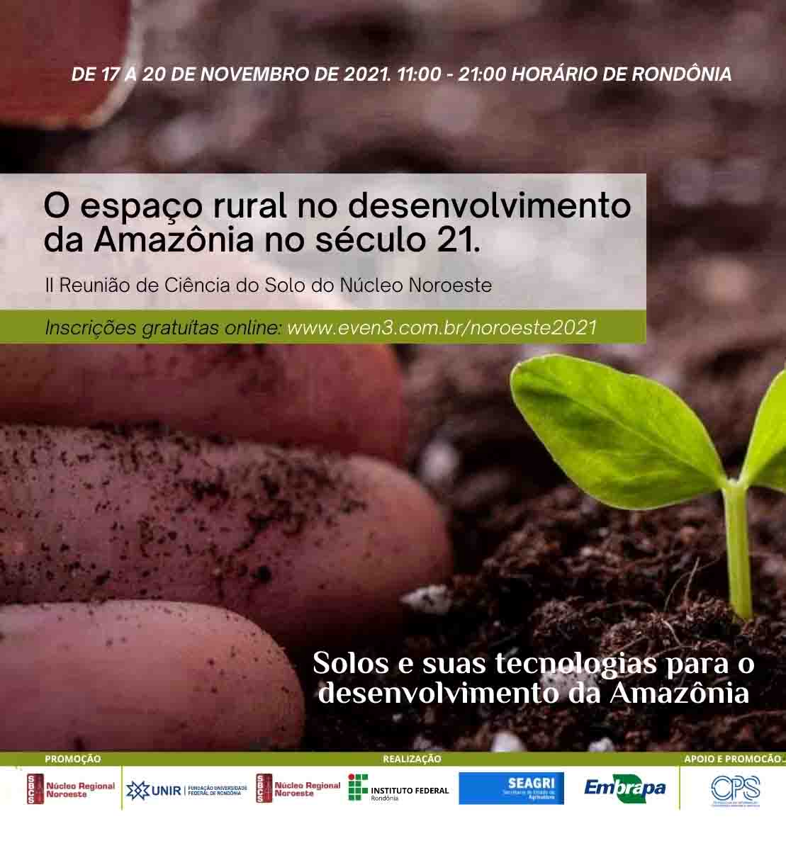 A II Reunião de Ciência do Solo do Núcleo Noroeste será realizada de 17 a 20 de novembro de 2021, das 11h às 21h (horário de Rondônia) e no formato online. Traz como tema "O espaço rural no desenvolvimento da Amazônia no século 21”. As inscrições para participar do evento estão abertas, são gratuitas e voltadas para profissionais e cientistas ligados às Ciências Agrárias, em especial à Ciência do Solo, assim como também estudantes, professores, produtores rurais, consultores e outros profissionais interessados. Inscrições, programação e mais informações podem ser obtidas no endereço eletrônico: https://www.even3.com.br/noroeste2021/.