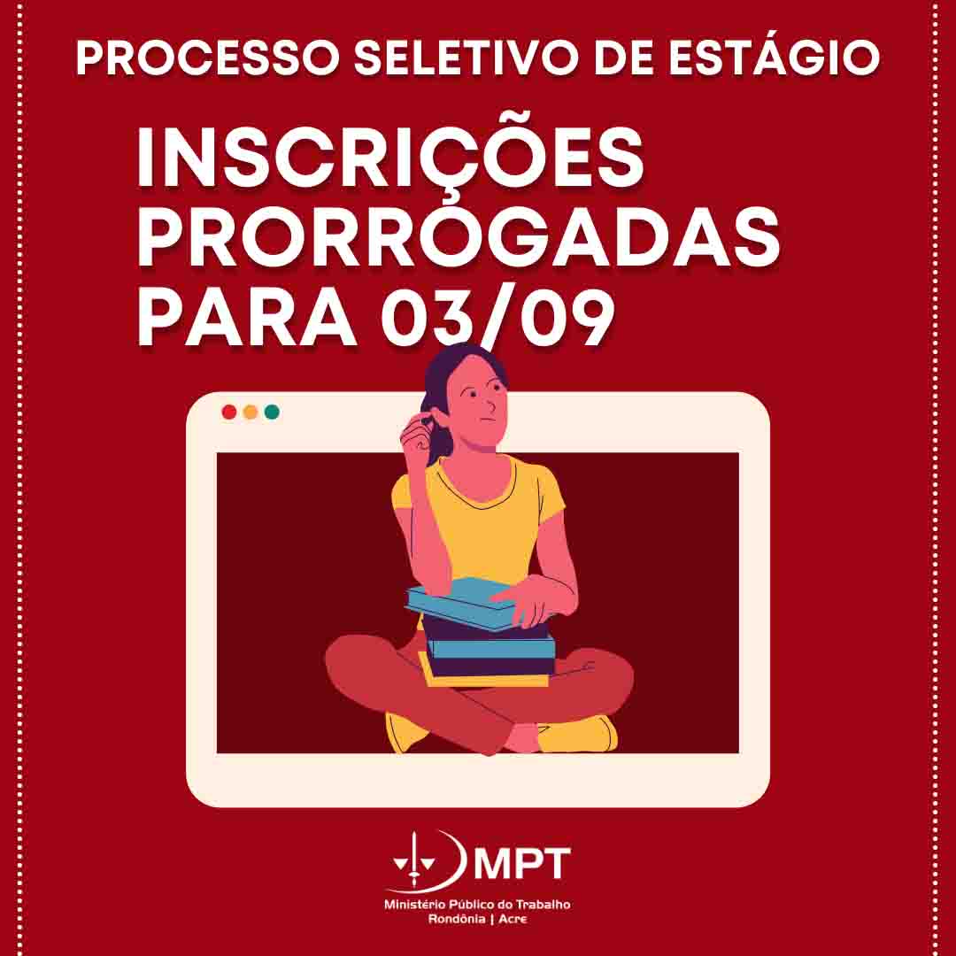 A Procuradoria Regional do Trabalho da 14ª Região / Rondônia e Acre informa que o prazo para as inscrições no Processo Seletivo de Estágio 2021 foi prorrogado e as inscrições estão abertas até às 23:59h do dia 03/09/2021, sexta-feira. O processo seletivo de estágio contempla cursos superiores em diversas áreas para a Sede, em Porto Velho, e as Procuradorias do Trabalho nos Municípios de Ji-Paraná (RO) e Rio Branco (AC).