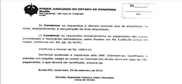 A Juíza de Direito Dra Michiely Valezi, na parte dispositiva da sentença diz que: “ condenar os requeridos e demais pessoa que se encontram no local, solidariamente, a reparação da área degradada”.