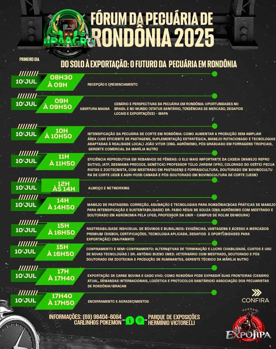 A abertura oficial do evento está marcada para o dia 10 de julho, às 9h, com a presença de autoridades e lideranças do setor. No mesmo dia, o Fórum do Produtor Rural de Rondônia 2025 será realizado com o tema “Alimentando Gerações”, visando capacitar produtores para gerar alimentos de qualidade e agregar valor à produção. O Jipa Agro também realiza o Concurso Leiteiro e o Leilão de Animais.