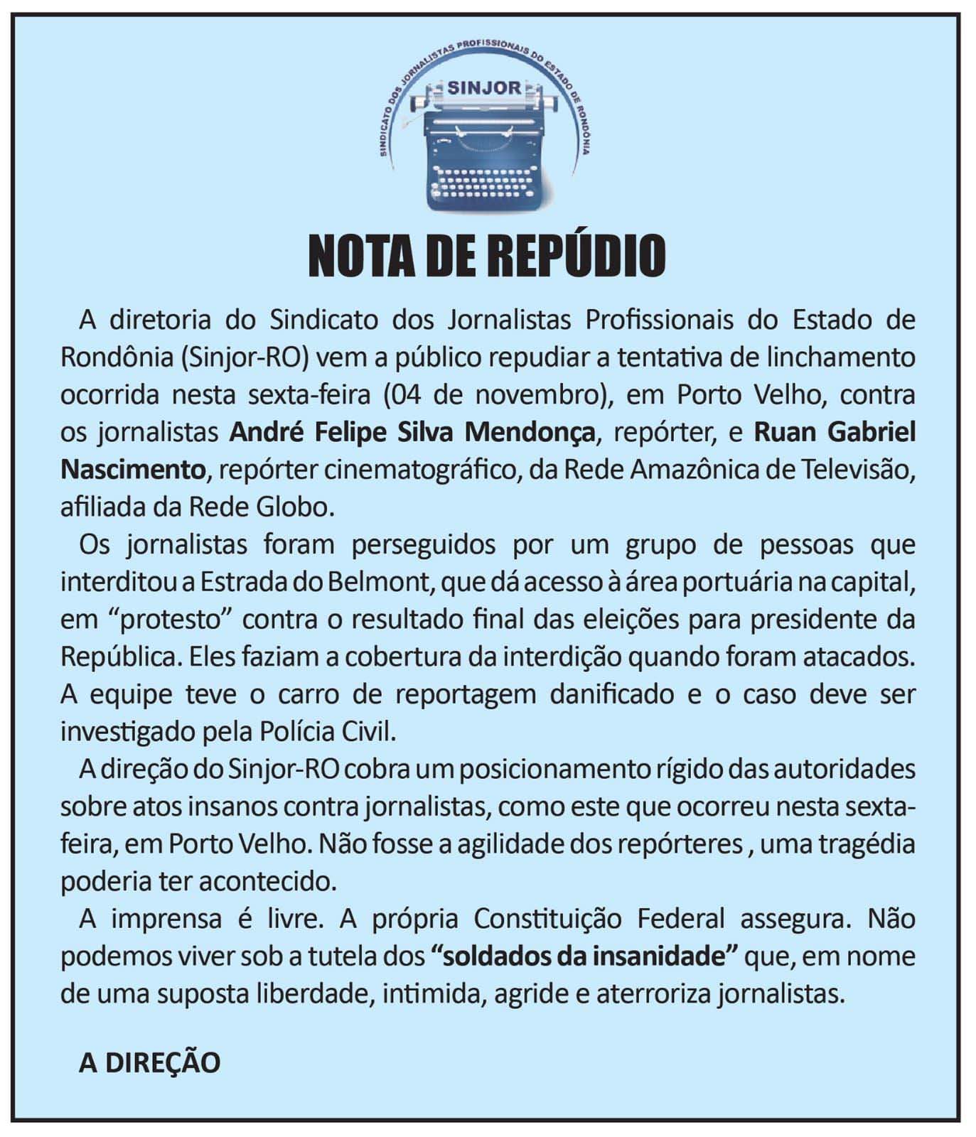 A tentativa de agressão foi noticiada hoje pelo Sinjor – Sindicato dos Jornalistas de Rondônia – que emitiu uma Nota de Repúdio. Na nota, a direção do sindicato repudiou o ataque e cobrou apuração rígida contra os “soldados da insanidade”, que “em nome de uma suposta liberdade intimida, agride e aterroriza jornalistas”. O grupo fazia protesto contra o resultado final das eleições para Presidente da República.