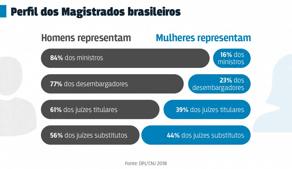 Levantamento feito em 2018 pelo CNJ revelou o perfil sociodemográfico da magistratura brasileira: a participação das mulheres no Judiciário ainda é menor que a de homens – 37% mulheres e 63% homens. A pesquisa revelou que as mulheres ainda progridem menos na carreira jurídica em comparação com eles. Elas representam 44% no primeiro estágio da carreira (juiz substituto), quando competem com os homens por meio de provas objetivas e passam a corresponder a 39% dos juízes titulares. No entanto, o número de juízas se torna menor de acordo com a progressão na carreira: representam 23% das vagas de desembargadores e 16% de ministros dos tribunais superiores.