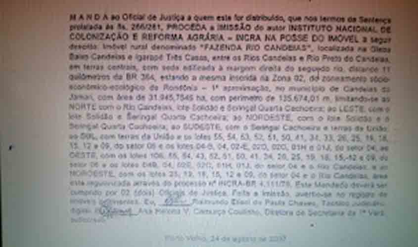 | Parte do documento que provê a imissão de posse da área ao Incra, assinado em 24 de agosto de 2007/ Fonte: acervo CPT-RO |