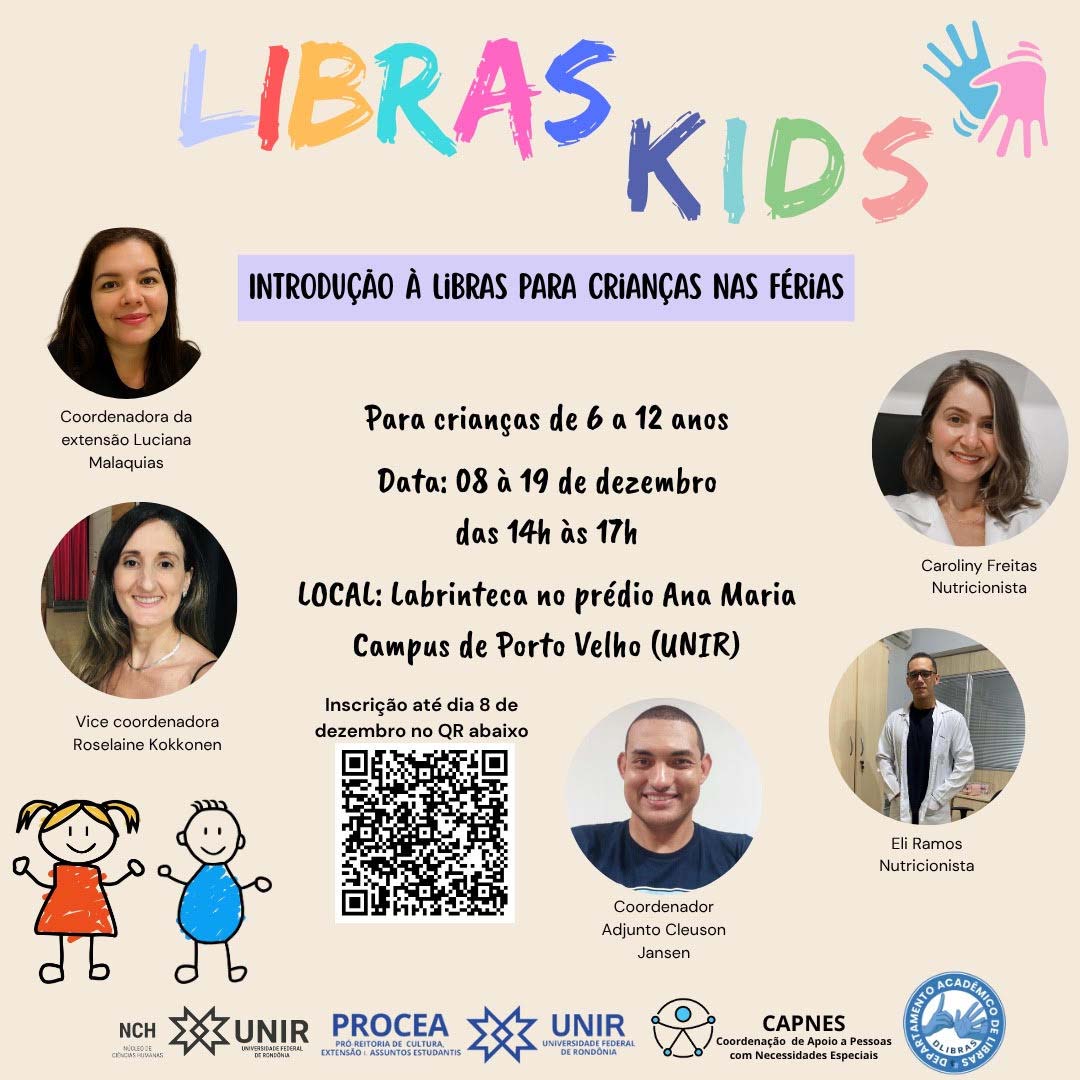 A Universidade Federal de Rondônia (UNIR), por meio da Pró-Reitoria de Cultura, Extensão e Assuntos Estudantis (Procea), anuncia a abertura das inscrições para o projeto de extensão Libras Kids, voltado a crianças de 6 a 12 anos. As inscrições seguem abertas até 8 de dezembro e podem ser feitas pelo QR Code do banner de divulgação ou pelo formulário online (neste link) disponibilizado pela organização.