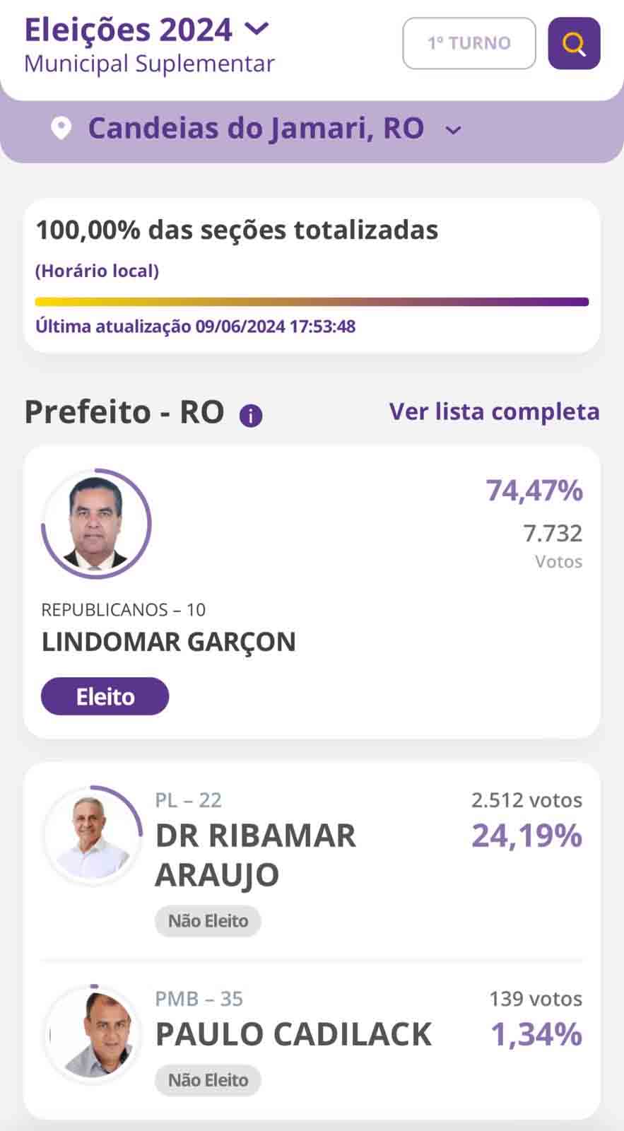 O ex-deputado federal Lindomar Garçon foi eleito neste domingo (9) para comandar o Município de Candeias do Jamari. Com quase 75% dos votos válidos, Garçon obteve 7.732 votos na eleição suplementar, superando Ribamar Araújo, que recebeu 24,19% dos votos (2.512 votos). Paulo Cadilack ficou em terceiro lugar, com apenas 139 votos (1,34%).