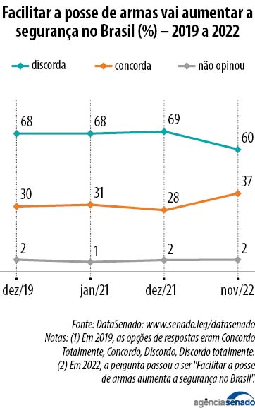 Assim que encerrado o segundo turno das eleições do ano passado, a equipe do Instituto DataSenado perguntou aos brasileiros: “Facilitar a posse de armas vai aumentar a segurança no Brasil?". Em resposta, 60% dos entrevistados discordaram de medidas nessa direção. Em 2021 o índice de discordância havia sido de 69%. Já o percentual de brasileiros que acreditavam que ampliar o acesso a armas poderia ajudar a diminuir a violência cresceu de 28% em 2021 para 37% 2022.