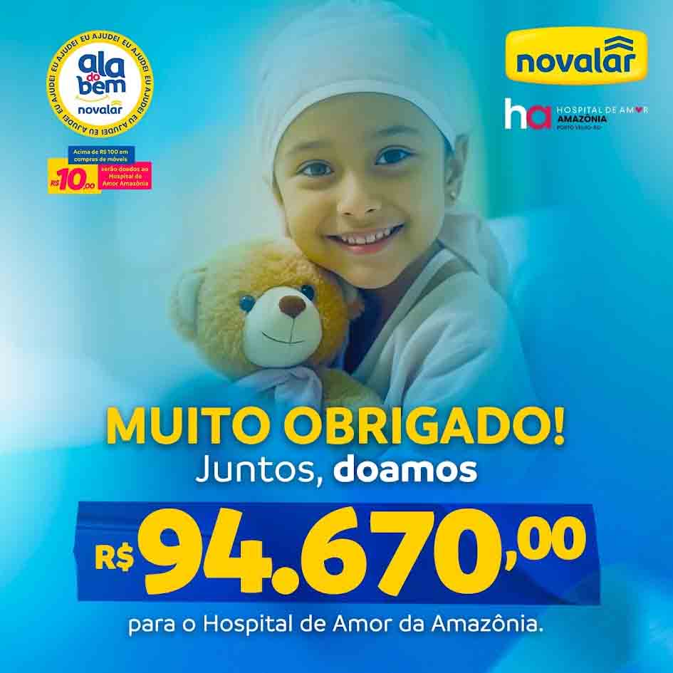 Finalizado o período da promoção, após a apuração das vendas totais que seguiam o critério para a doação, é com alegria que a Novalar comunica que o resultado superou o alcançado na primeira edição: o valor da doação foi de R$94.670,00. Quase o dobro do realizado em 2023. Os recursos recebidos pelo Hospital de Amor da Amazônia são destinados para suas mais diversas necessidades no que se refere ao tratamento contra o câncer de crianças, jovens e adultos.