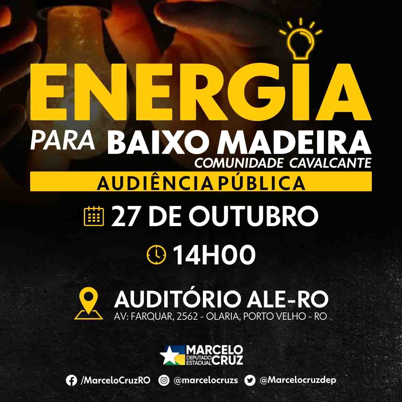O deputado estadual Marcelo Cruz (PATRIOTA), é o autor do requerimento da audiência pública que ocorrerá na Assembleia Legislativa, na próxima quarta-feira (27), às 14 horas, no auditório da casa de leis. O tema da audiência tratará sobre a implantação de energia elétrica para o baixo madeira, especificamente para a comunidade de Cavalcante. Foram convidados diversas autoridades, como representantes do Ministério Público Estadual e Federal, Tribunal de Contas, Tribunal de Justiça, Ministério de Minas e Energia, bem como o Presidente da Energisa, e outros.