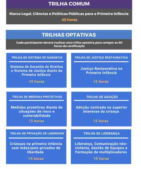 Alunos e alunas também devem escolher uma entre seis trilhas optativas: Sistema de Justiça e Sistema de Garantia de Direitos da Criança e do Adolescente; Medidas protetivas diante de situações de risco ou vulnerabilidade; Primeira Infância e Justiça Restaurativa; Adoção centrada no superior interesse da criança; Crianças na primeira infância com mães/pais privados de liberdade; e Liderança, Comunicação não-violenta, Gestão de Equipes e Formação de Multiplicadores. Para aprovação, o rendimento mínimo é de 70% do total de pontos de cada módulo – comum e uma optativa. A certificação será emitida com uma carga-horária de 60h.