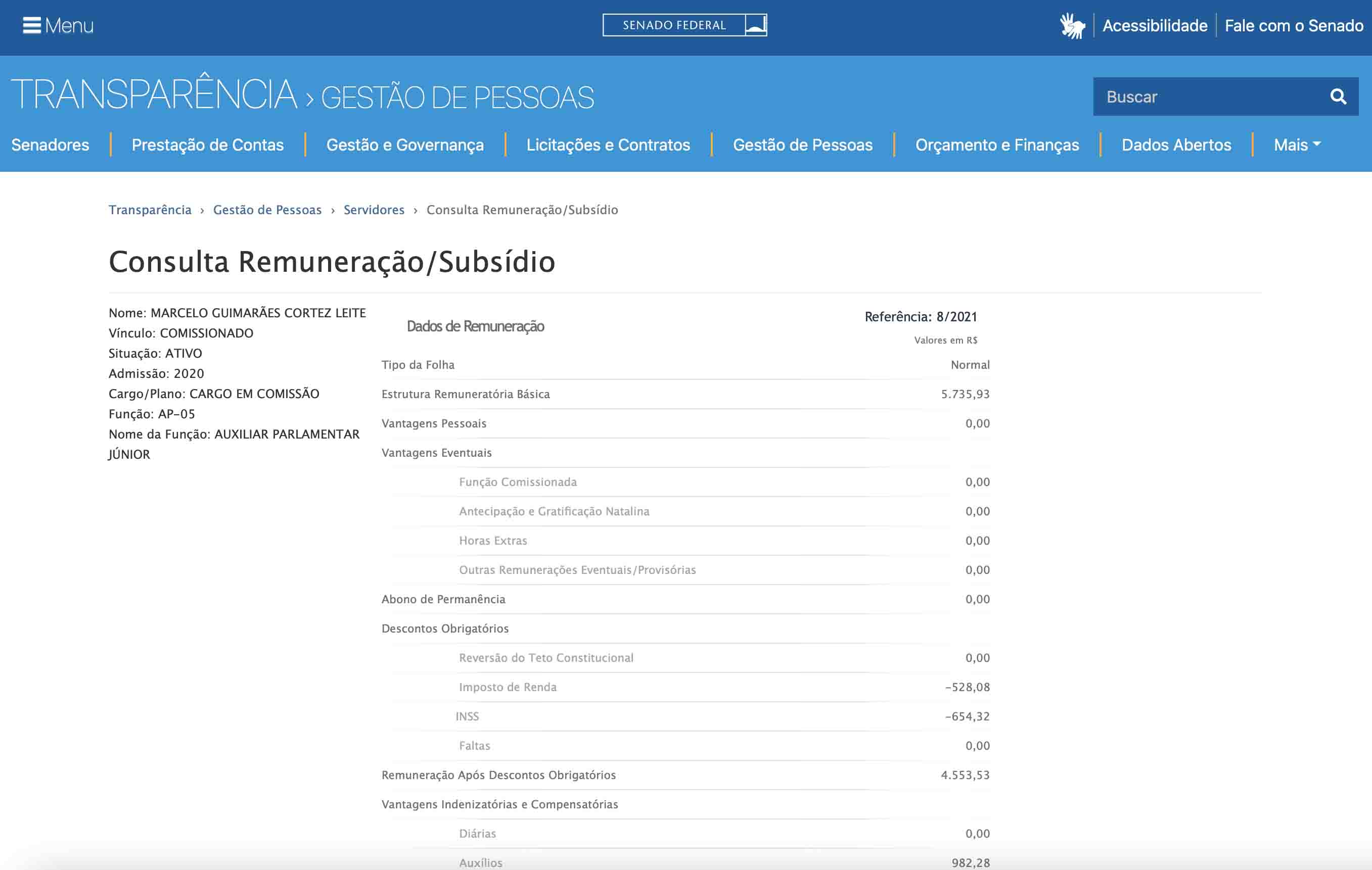 No portal da Transparência do Senado, o nome de Marcelo Guimarães não aparece mais na listagem de servidores comissionados, mas na folha de pagamento é possível ver que ele recebeu normalmente até agosto deste ano. O senador também não informou quais os trabalhos que Marcelo realiza para seu gabinete.