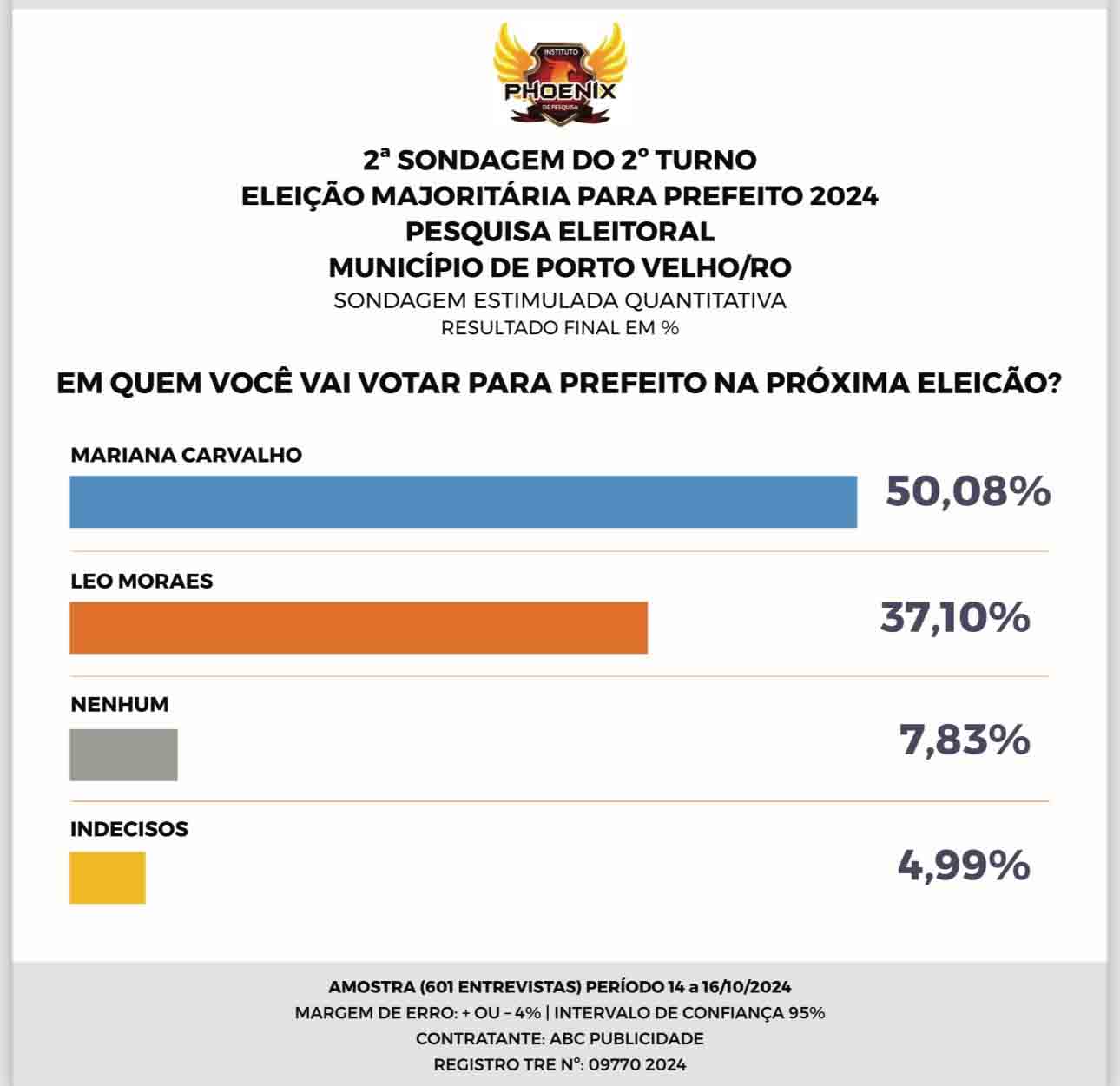 No novo levantamento do Instituto Phoenix, divulgado nesta quarta-feira (16), Mariana Carvalho aparece com 50,08% das intenções de votos, contra 37,10% do candidato Leo Moraes, mantendo um cenário estabilizado em relação à pesquisa anterior, divulgada no último domingo (13).