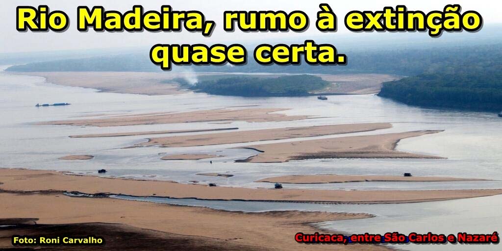 O rio Madeira está hoje com apenas um metro e trinta centímetros de água. Se não chover pra valer a partir de outubro próximo, vai secar ainda mais e a travessia nele “sem molhar os pés”, que antes era impossível, vai se tornar uma realidade. Até as embarcações de pequeno porte têm restrição para navegar em seu leito seco, cheio de pedras e bancos de areia. A navegação noturna foi proibida. Vilarejos como São Carlos, Nazaré e Calama têm dificuldade de acesso. O rio Madeira já está morto. As hidrelétricas em seu curso condenaram-no à extinção. E as dragas do garimpo ilegal extraindo ouro em seu leito cambaleante e removendo areia completaram o serviço. Provavelmente o velho Madeira nem canal tem mais. Ali está tudo revirado, mexido, destruído. Assorearam o maior rio dos rondonienses. Os poucos peixes que ainda existem estão contaminados pelo mercúrio.