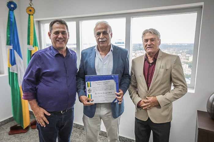 O médico Eliu de Freitas Cabral, com mais de três décadas de atuação em Rondônia, foi agraciado com o título de cidadão honorífico de Rondônia. O presidente da Assembleia Legislativa, Maurão de Carvalho (MDB), proponente da honraria, fez a entrega na tarde de ontem (29), em seu gabinete no Palácio Marechal Rondon.