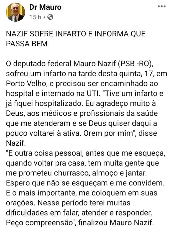 Porto Velho - Uma publicação feita nas redes sociais durante a noite da quinta-feira (17), informou o estado de saúde do deputado federal e ex-prefeito de Porto Velho, Mauro Nazif (PSB).