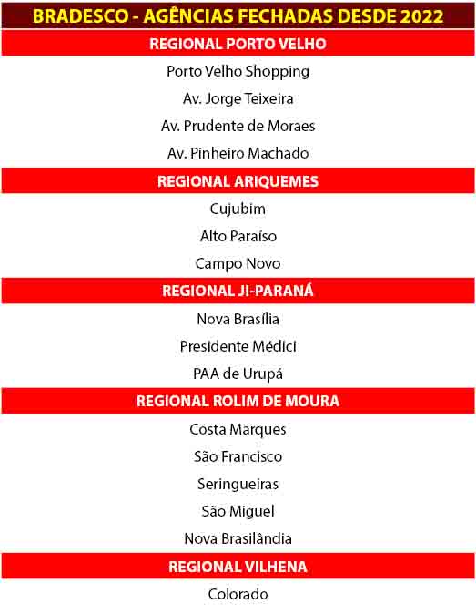E este quadro aterrorizante se repete em Rondônia, com o fechamento de 16 agências em todo estado desde que Ivone Colombo assumiu como presidenta do Sindicato dos Bancários e Trabalhadores do Ramo Financeiro de Rondônia (SEEB-RO), em julho de 2022 (veja quadro abaixo).